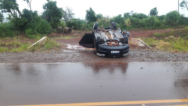 SAN VICENTE. Fue en San Vicente cerca de las 13:50 en Ruta Provincial N° 221. Marino O. F. (52) domiciliado en el ex Km 1268 de la Ruta Nacional 14, circulaba al mando con su Chevrolet Onix color negro en sentido Aurora – San Vicente cuando al llegar a la altura del Kilometro N° 28 despista al pisar un espejo de agua. El rodado terminó sobre su mismo carril de circulación en posición invertida sobre la banquina.