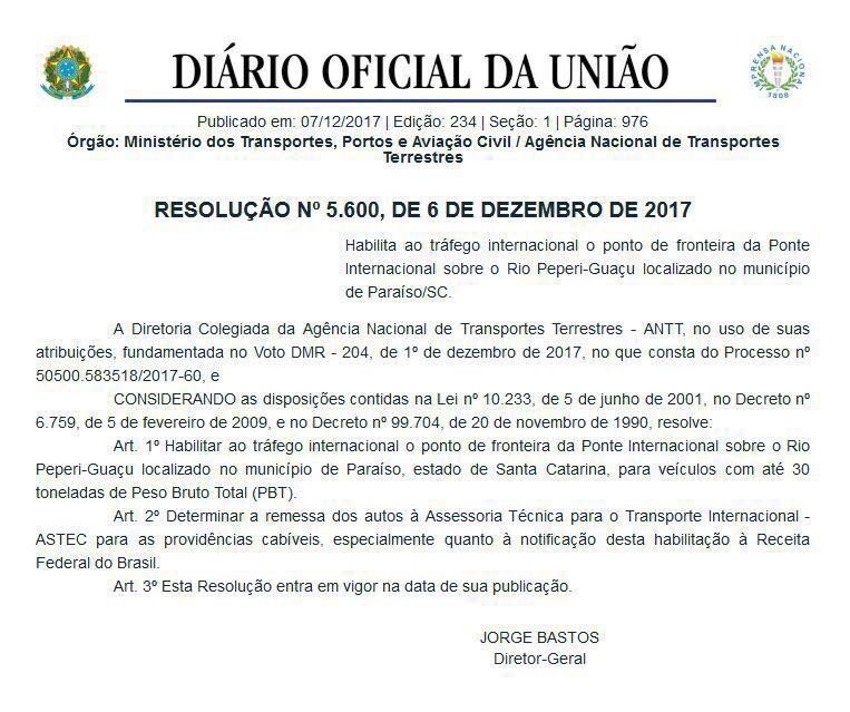 BRASIL. La Dirección Colegiada de la Agencia Nacional de Transportes Terrestres de Brasil –ANTT- autorizó el tráfico internacional en el puente Rosales sobre el río Pepirí-Guazú localizado en el municipio de Paraíso, en el estado de Santa Catarina, en frontera con Argentina que, mediante la ruta 27, une Sao Miguel Oeste con San Pedro Misiones.