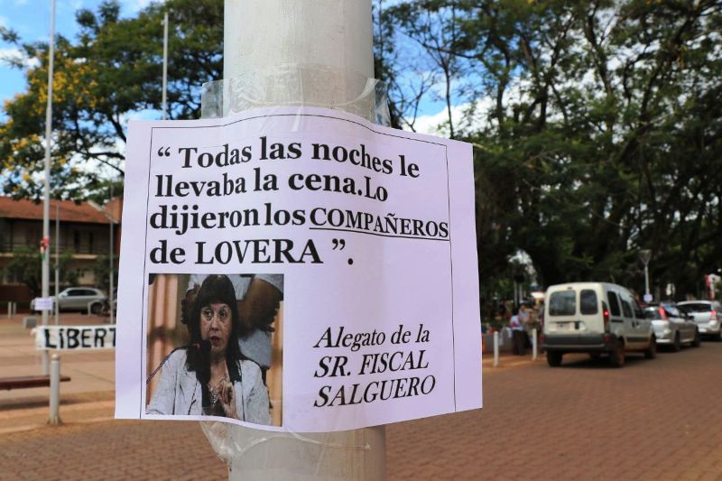 En los carteles escracharon a la fiscal Estela Salguero que solicitó prisión perpetua por «homicidio calificado agravado por el vínculo con alevosía» y «homicidio con alevosía» para Rolando Lovera, su ex pareja.