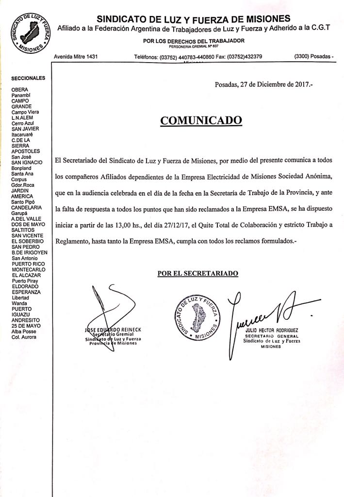 MISIONES. Desde el sindicato de Luz y Fuerza cuyos agremiados se desempeñan en la empresa estatal EMSA, informaron que a las 13:00 de hoy miércoles comenzó un paro con quite de colaboración y trabajo a reglamento por tiempo indeterminado hasta que Electricidad de Misiones Sociedad Anónima cumpla con los planteos de la audiencia de esta mañana, considerando insuficiente la respuesta de la empresa.