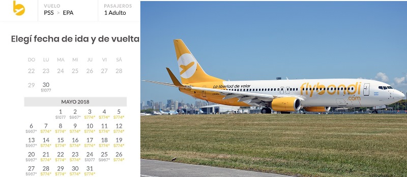 POSADAS. La aerolínea low cost que hizo su debut en el país en diciembre visitando diferentes aeropuertos, entre ellos la capital provincial, Flybondi, lanzó sus promociones. De Posadas a Buenos Aires (aeropuerto El Palomar) operará desde el 30 de abril con precios que van desde 774 pesos el pasaje, por debajo de los precios en ómnibus, incluso los semi cama que arrancan en 1270 pesos, significando una competencia fuerte.