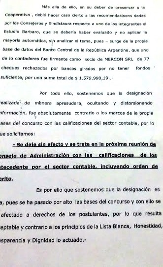 Bárbaro insistió en que su colaborador no tiene impedimentos ni denuncias, y recordó que por el contrario, el contador designado para el ejercicio anterior (sin concurso), Mauro Mecozzi, sí tenía denuncias personales por maniobras en otra cooperativa lo que derivó en un juicio aunque fue absuelto en 2012.