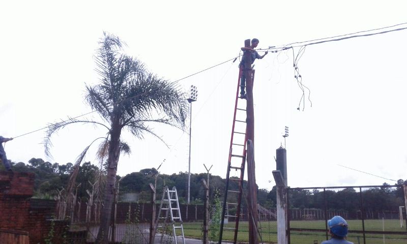 OBERA. Tras el temporal de ayer, algunos postes del tendido eléctrico dentro del Complejo Polideportivo Ian Barney han sufrido daños y caídas, operarios de electricidad del municipio trabajaron en la reparación, para poner nuevamente en funcionamiento el suministro de energía eléctrica del predio.