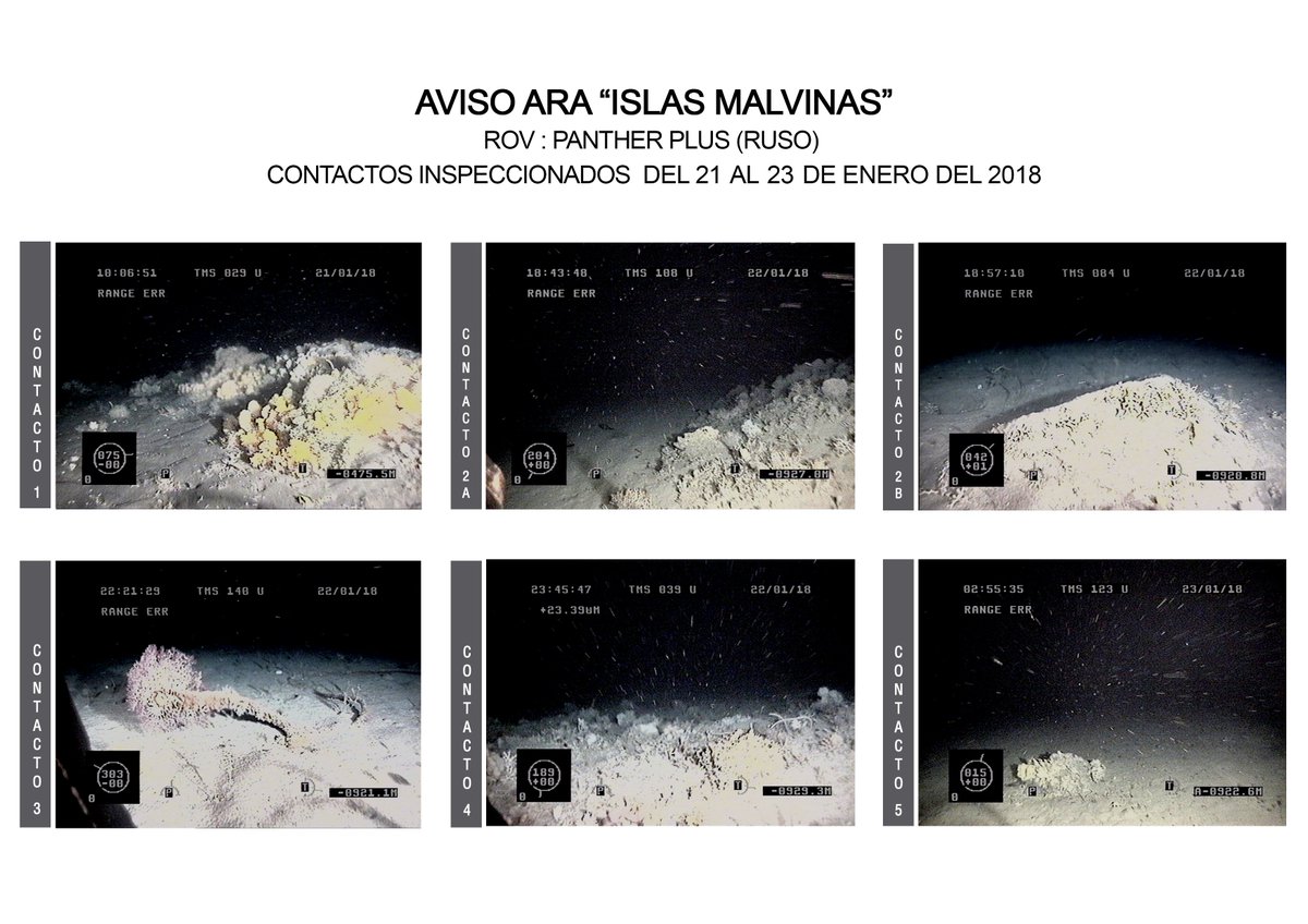 En los últimos días, el aviso ARA “Islas Malvinas” investigó con el ROV “Phanter Plus” cinco contactos que habían sido detectados por el sonar de casco en forma activa de la corbeta ARA “Spiro”, los que no correspondieron con el submarino; quedando pendiente la identificación de otro contacto en el transcurso del día, supeditado a las condiciones meteorológicas reinantes.