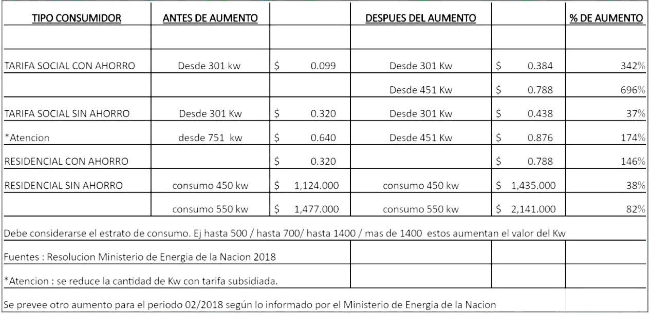 Cabe recordar que, la reducción del subsidio nacional es del 20 %, pasando el valor mayorista del kw de 0,64 centavos a 0,80 centavos en diciembre, más el VAD (transporte de al energía), pero cada provincia establece su cuadro tarifario.