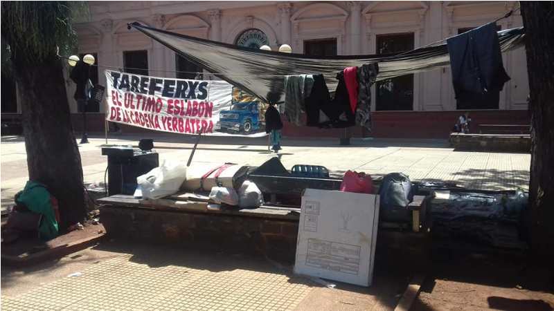 POSADAS. Cosecheros de yerba mate de Oberá mantienen el campamento desde el lunes en la plaza 9 de julio frente a Casa de Gobierno pidiendo por asistencia social mediante un bono de 2 mil pesos y kits de útiles escolares para el inicio de clases, con la amenaza de volver a cortar el acceso al puente internacional San Roque González como el martes.