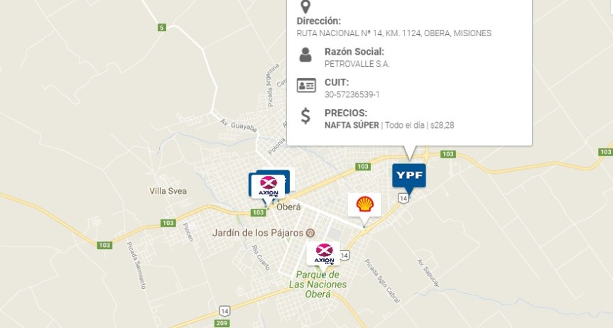 En cuanto a Shell, en Oberá las estaciones de servicio tienen a 28,58 pesos y Axion al mismo valor de YPF. En la Oíl de Alem, el precio según el Ministerio se mantiene en 27,98.