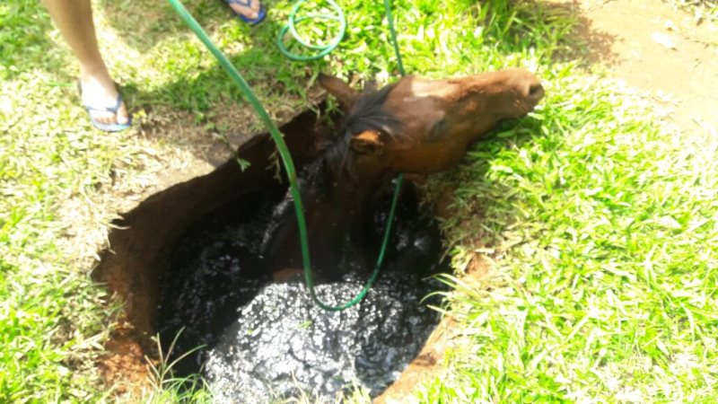 Con gran esfuerzo los uniformados presentes mantuvieron al caballo con la cabeza afuera, hasta la llegada de máquinas que permitieron el rescate del animal que se encuentra en buen estado.
