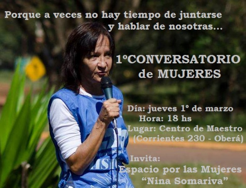 OBERA. Mediante un comunicado que reza «Porque en esta sociedad a veces no hay tiempo de juntarse y hablar de nosotras» desde el Espacio por las Mujeres “Nina Somariva” invitan al 1º CONVERSATORIO de MUJERES a realizarse el jueves 1º de marzo a las 18 hs. en Casa del Maestro de Oberá y Colonias (calle Corrientes 230).