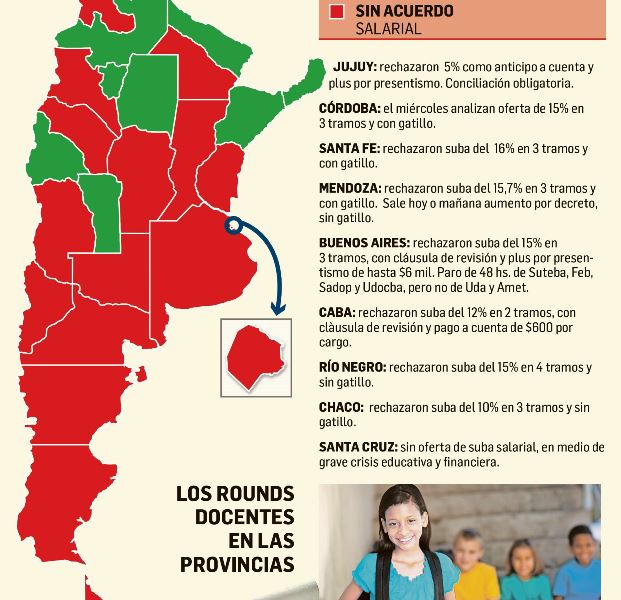 Esos entendimientos abarcan subas de entre el 15% y el 21%, con y sin cláusula gatillo. Pese a ello, en algunos de esos distritos habrá hoy paro, en línea con CTERA. En el resto seguirán pulseando, aunque en Mendoza el radical Alfredo Cornejo confirmó que tras el fracaso en el round sacará por decreto, entre hoy y mañana, una suba del 15,7% en 3 tramos y sin gatillo.