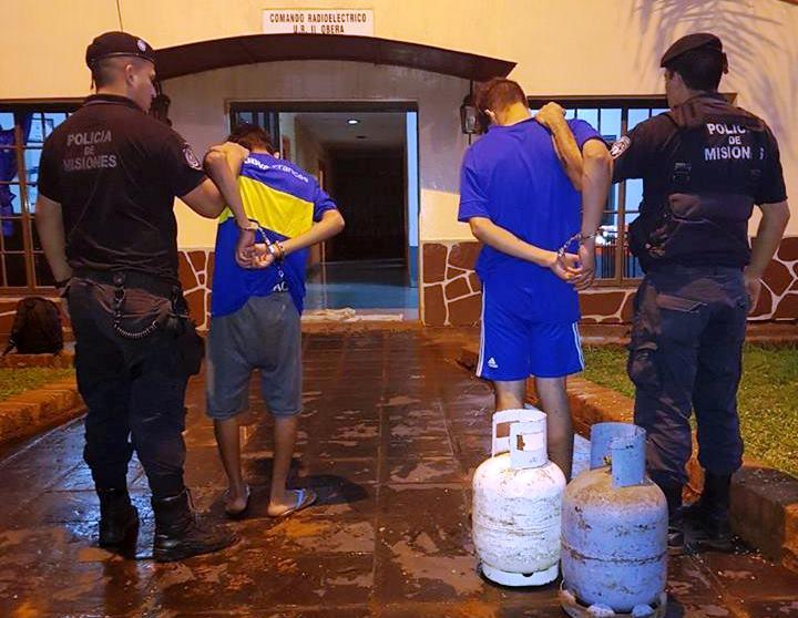 OBERÁ. El procedimiento se concretó hoy a las 6:30 en la avenida Juan Domingo Perón de Oberá, cuando efectivos de la división Comando Radioeléctrico, realizaban recorridas de prevención y observaron a dos jóvenes, cada uno transportando una garrafa de gas. Al notar la presencia de la Policía, emprenden una veloz fuga, pero fueron rápidamente detenidos. Se trata de Rodrigo V. (18), y Darío S. (18). En el marco de la investigación se estableció que estos objetos fueron sustraídos en una vivienda, propiedad de Patricia D. S. (35), quien radicó la formal denuncia ante la seccional Cuarta, dependiente de la Unidad Regional II.