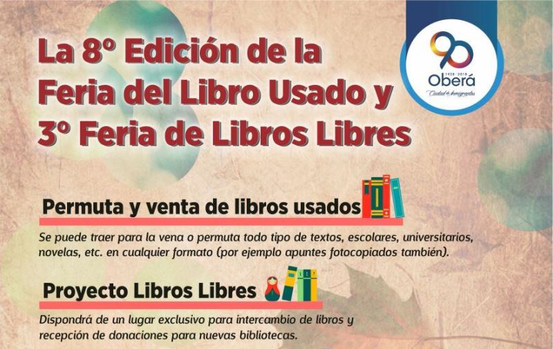 OBERA. La Municipalidad invita a todos los interesados a participar de la 8º edición de la Feria del Libro Usado y la 3º Feria de Libros Libres. Será este domingo 18 de marzo, de 17 a 21 horas, en el Centro Cívico.