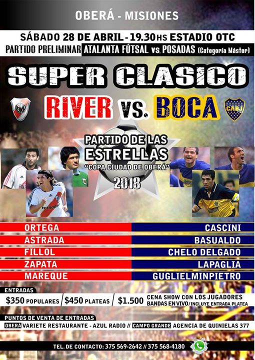 OBERA. El 28 de Abril se disputará el «Partido de las Estrellas, Copa Ciudad de Oberá», donde participarán los jugadores que marcaron la historia de River y Boca, el SUPERCLÁSICO en el estadio del OTC a partir de las 19:30.
