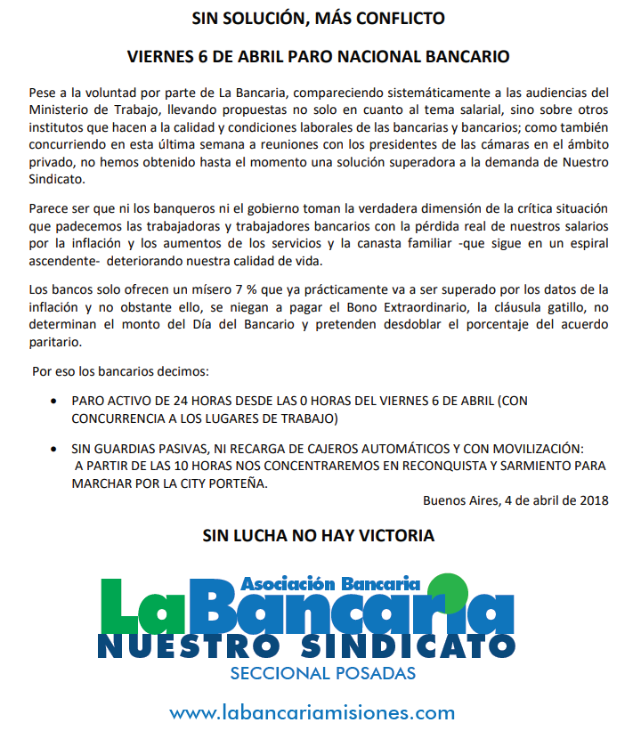 OBERA. Los tres bancos de la ciudad están a puertas cerradas debido al paro activo de 24 horas desde las 0 horas del viernes 6 de abril, sin guardias pasivas, ni recarga de cajeros automáticos y con movilización.