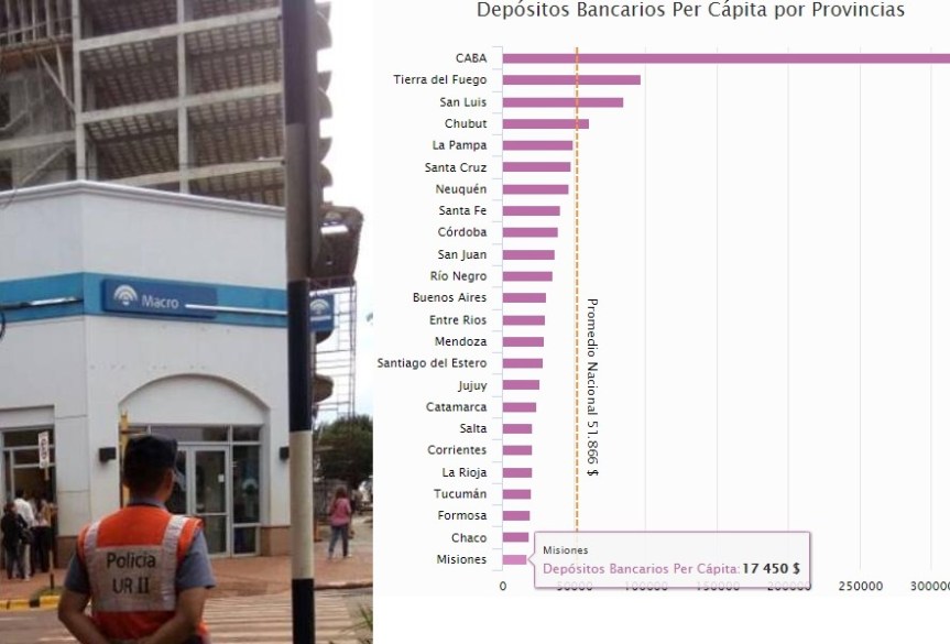 MISIONES. En los bancos misioneros, públicos o privados el promedio de ahorro asciende a $17.450 per cápita, la más baja del país, evidenciando la escasa capacidad de guardar dinero de los habitantes de la provincia. Le siguen Tucumán ($20.182), Formosa ($19.779) y Chaco ($18.978). A nivel nacional, el promedio de ahorro bancario asciende a $51.866.