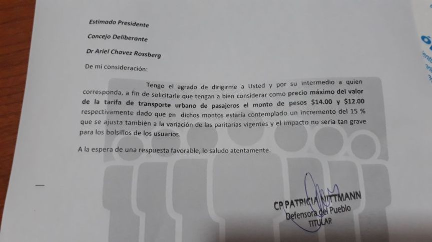 En la misiva pidió que el valor no superara los 14 pesos para el único sin tarjeta y 12 para quienes utilizan el sistema electrónico fundamentando que el «incremento del 15 % se ajusta a la variación de las paritarias vigentes y el impacto no sería tan grave para los bolsillos de los usuarios». En su debut sobre tarifas y servicios públicos, la renovadora no tuvo éxito, y el deliberativo votó por un monto 1,50 pesos arriba de lo solicitado por la defensoría.