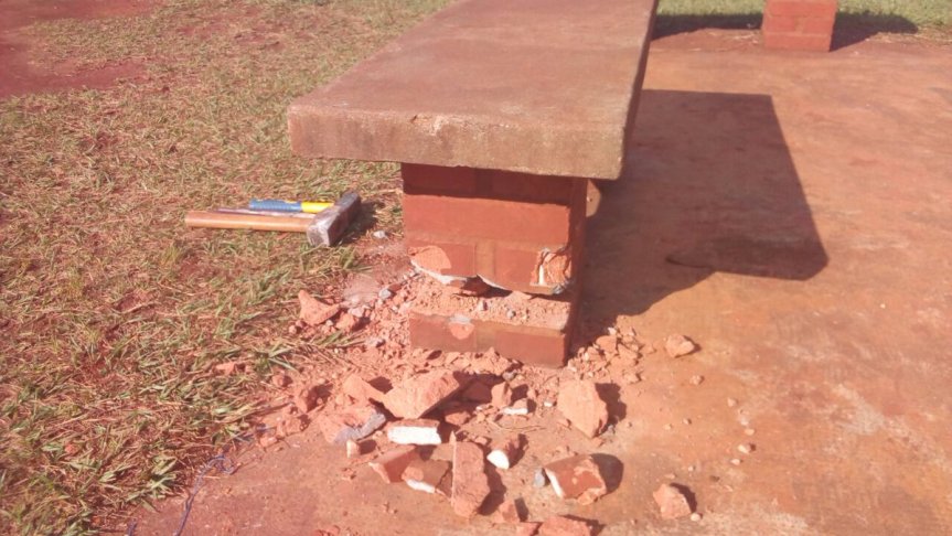 El procedimiento se concretó esta tarde alrededor de las 15 hs cuando el personal encubierto sorprendió a los revoltosos en pleno destrozo de los bancos de cemento del espacio público. Ambos tenían consigo mazos además hierros con puntas. Aparentemente estaban extrayendo los trozos de ladrillos para un ataque en patota.