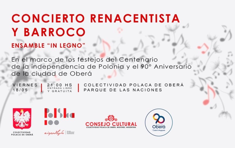 Este mes invitamos a toda la comunidad a disfrutar del “Concierto Renacentista y Barroco” a cargo de Ensamble “In Legno” oriundos de la ciudad de Posadas. Este concierto se llevará a cabo en la Casa Polaca del Parque de las Naciones el día viernes 18 mayo a las 21, la entrada será libre y gratuita.