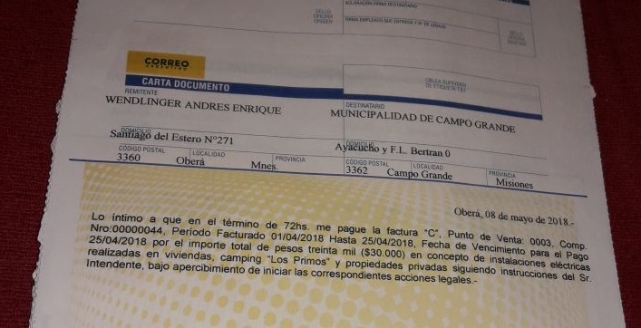 El principio de la denuncia se origina en el reclamo del electricista obereño Andrés Wendlinger por 30 mil pesos que le adeuda la jefatura comunal de Campo Grande, según consta en una carta documento enviada a la sede de esta corporación. La deuda en cuestión fue contraída en concepto de trabajos de instalación eléctrica realizados por Wendlinger en viviendas, camping “Los primos” y propiedades privadas por instrucción del intendente Sartori.