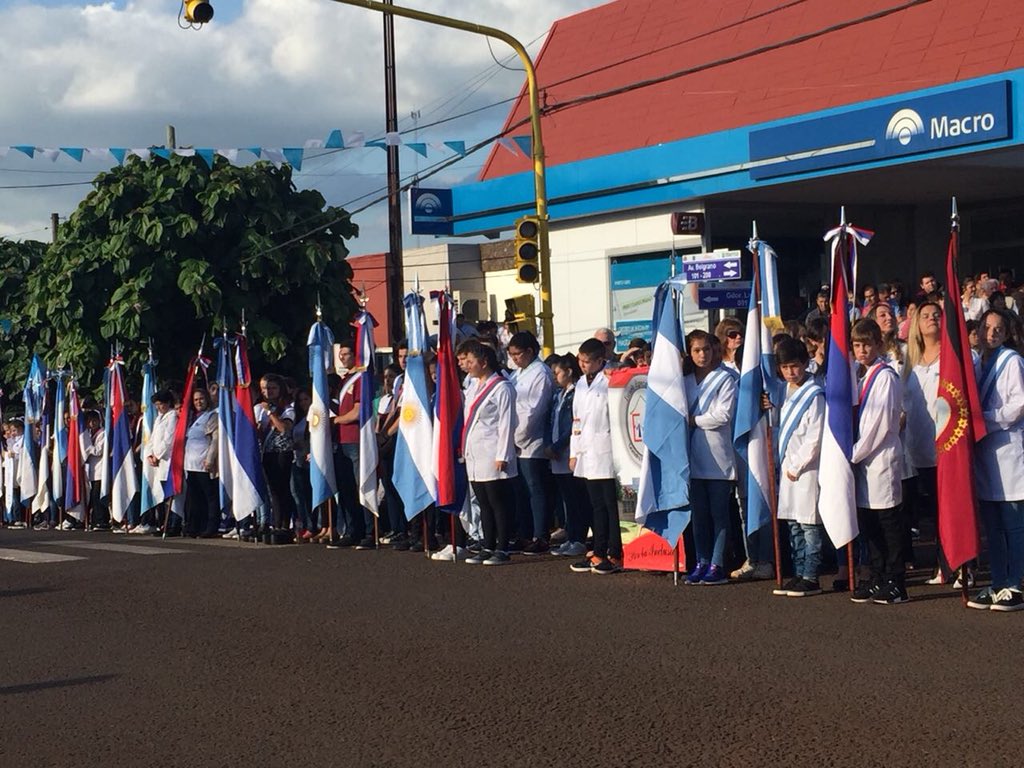 ALEM. Una multitud acompañó la ceremonia que comenzó apenas pasadas las cuatro de la tarde. Guirnaldas de color celeste y blanco, guardapolvos impecables con la escarapela en el pecho, atuendos de dama antigua, y pastelitos de hojaldre en algunos puestos de venta; daban el marco a una fiesta cuyo espíritu de celebración se sentía en el aire. La gente le puso el marco. Familias enteras desde ambos lados de la calzada de la avenida Belgrano de Leandro N. Alem, o desde los balcones, acompañaron con aplausos cada momento de la popular cita.