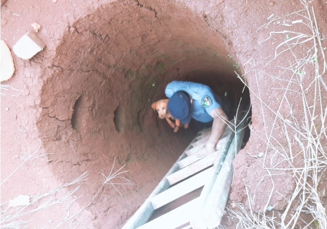 GUARANÍ. La intervención policial se produjo hoy a las 16:30 en el barrio Primavera de esta localidad, allí un perro se cayó en un pozo sin agua .