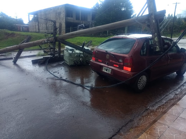 SAN VICENTE. En la tarde de este lunes, seguido a los postes que habían caído cerca de la Terminal, se produjo otro hecho sobre la misma calle Alberdi casi Balbín de San Vicente. Uvaldina P. (46) iba en su Wolkswagen Gol junto a su hija de 7 años cuando siente un fuerte golpe sobre el vehículo que la detiene, a los pocos segundos de da cuenta que el tendido eléctrico estaba sobre su vehículo. Por suerte no hubo que lamentar heridos, solo daños materiales.