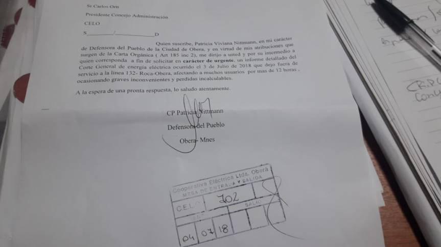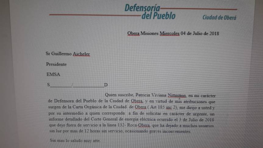 OBERA. La Defensoría del Pueblo a cargo de la renovadora Patricia Nittmann que llegó al poder por intermedio del intendente Carlos Fernández y el diputado Rafael Pereyra Pgierl (todos renovadores) elevó una nota a la CELO (dirigida por renovadores hasta el año pasado y por amigos de Hugo Passalacqua) y a la empresa estatal EMSA solicitando explicaciones por el corte de energía prolongado de este martes que dejó no solo a Oberá, si no a toda la zona centro sin electricidad durante 16 horas.