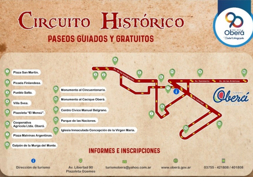 OBERA. La Municipalidad continúa este sábado desde las 14 realizando el paseo que recorre diferentes puntos de la ciudad, donde se repasa la historia de Oberá en sus 90 años de existencia. El recorrido involucra 13 lugares, uniéndolos en una distancia aproximada de 30 kilómetros; es completamente gratuito. Este sábado se suman a la Pre Fiesta del Inmigrante dado a que uno de los puntos que se recorre es el Parque de las Naciones.