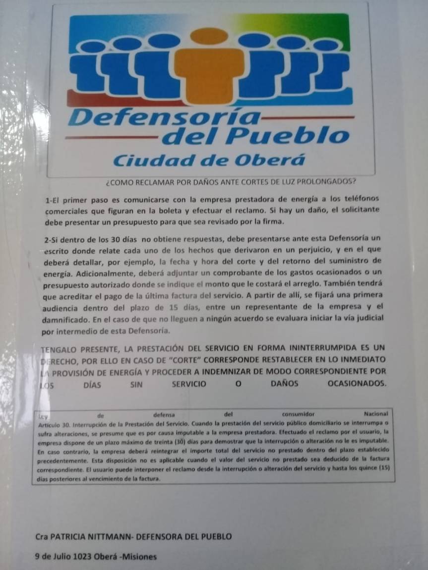 Por su parte, el asesor letrado Hugo Lesiuk, detalló que «empezamos a hacer publicidad respecto a este tema, hay cartelería, en la CELO tendría que haber, también en algunos supermercados, en la municipalidad que explican que deben hacer el usuario ante estos cortes, cómo puede reclamar tiene que hacer el reclamo antes de los 15 días de posterior al vencimiento de la factura en caso de cortes prolongados y la empresa prestataria tiene 30 días para resolver la situación y demostrar que no le es imputable la causa» y ejemplificó «pueden reclamar una persona que tiene un comercio y por esos cortes prolongados tuvo pérdidas de mercaderías, debe adjuntar los comprobantes que acrediten las pérdidas, y hacer el reclamo a la empresa prestataria del servicio eléctrico, en 30 días le tienen que dar una respuesta, si en 30 días no le dan una respuesta, se tienen que acercar acá, a la Defensoría del Pueblo, y desde la Defensoría vamos a citar a una audiencia de conciliación, y tratar de que reparen el daño ocasionado y si no se llega a un acuerdo, se va a llegar a una intervención legal».