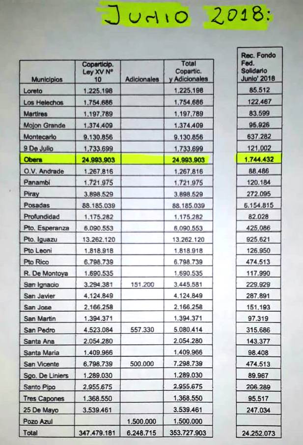 Junio: La municipalidad recibió 27 millones de coparticipación y soja, la mayor parte se va en sueldos