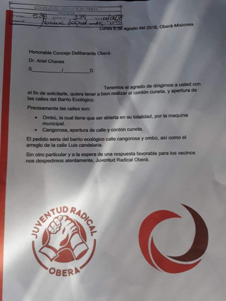 OBERA. La Juventud Radical elevó un pedido al Concejo Deliberante para apertura de calles y la construcción de cordón y empedrado, particularmente en calle Ombú y Cangorosa de barrio Esperanza. Además el arreglo de calle Luis Candelaria.
