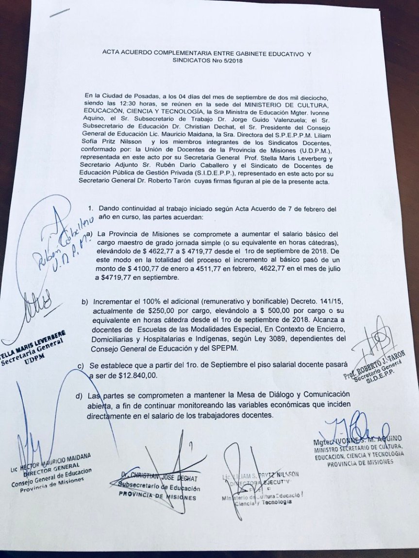 MISIONES. Se firmó un acta acuerdo que otorga un aumento salarial al básico por cargo o su equivalente en horas cátedras a partir de septiembre; quedando el cargo de maestro o jornada simple básico de $4.622 a $4.719 (97 pesos); un 100% de un adicional para escuelas especiales, contexto, EIB, hospitalarias. Además establece que a partir de este mes, el piso salarial docente queda en 12.840 pesos.