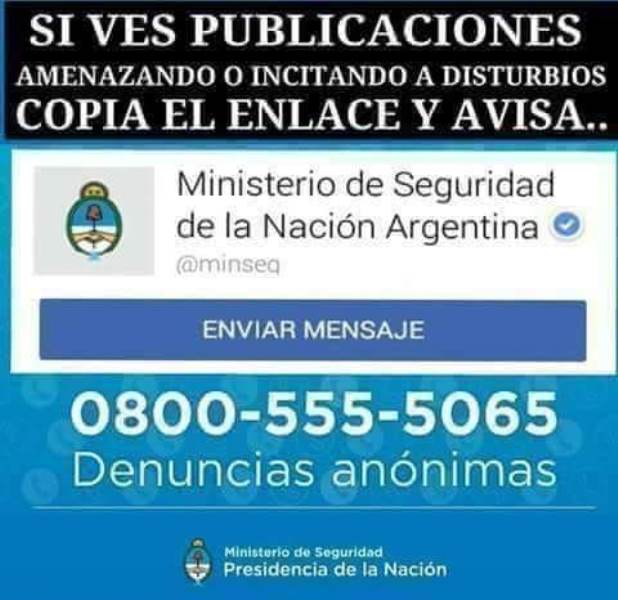 La persona que tiene información sobre quienes «auspicien u organicen saqueos por las redes» podrá realizar la denuncia a través del 0800-555-5065.