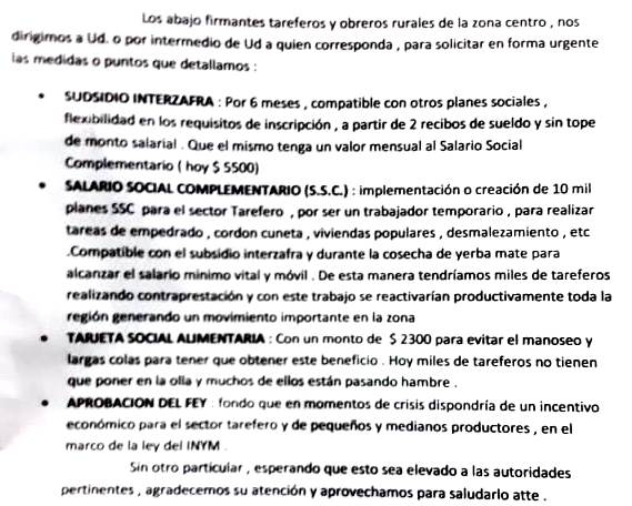 Reclaman además el subsidio Interzafra en un monto de 6.500 pesos para todos los tareferos durante seis meses comenzando en octubre, flexibilización en los requisitos (tres y no cinco recibos de sueldo), salario social complementario y un aumento del 35 por ciento en la tarifa que cobrarán en la próxima cosecha, igual demanda que realizan otras agrupaciones, entre la que inició un corte en la ruta 14 a la altura de Aristóbulo del Valle este miércoles.