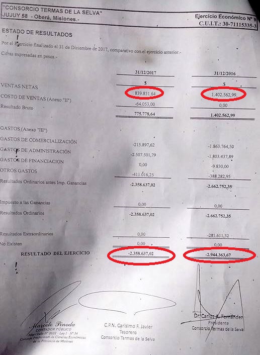 OBERA. Resultados de los ejercicios de los últimos dos años que cerraron en diciembre de 2016 y de 2017, el parque termal obereño, símbolo de la corrupción en la era Rindfleisch donde se erogaron millones de pesos a discreción; continúa dando pérdidas abultadas cada año.