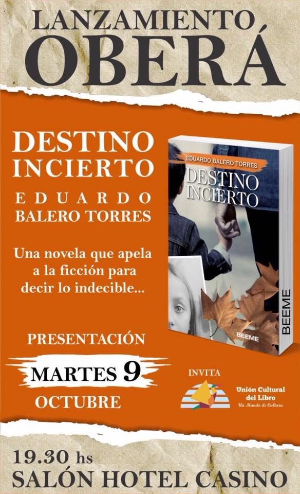 OBERA. Este martes a las 19.30, el polémico renovador Eduardo Balero Torres, ex titular del IPLYC, llevará a cabo el lanzamiento de su libro denominado «Destino Incierto». Algunos pensaron que el título refería a Misiones gobernada por la Renovación pero no, es una novela.