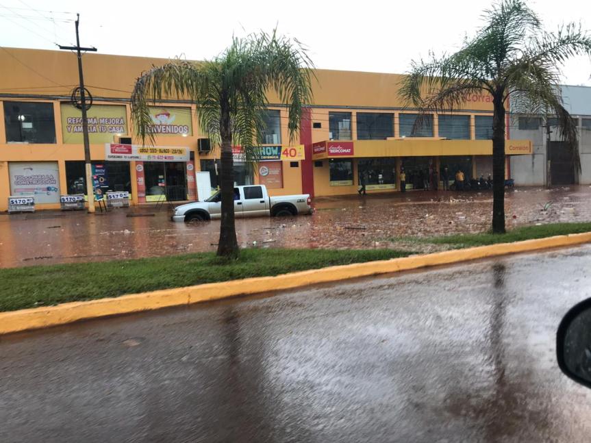 OBERA. La intensa lluvia de este miércoles en horas del mediodía dejó zonas anegadas superando la capacidad de drenaje de los arroyos además la basura que tapa las alcantarillas. En avenida de las Américas, la parte baja cruce con Avenida Perón quedó literalmente bajo agua detrás del barrio Judiciales, frente a un conocido comercio del rubro de la construcción por lo que la mitad de la calzada debió ser cerrada parcialmente debido a la corriente del Mbotaby, al igual que avenida Sarmiento en zona plazoleta Italia (entre Neuquén y Río Negro) y el Complejo Deportivo por le fuerte caudal del arroyo Tuichá.