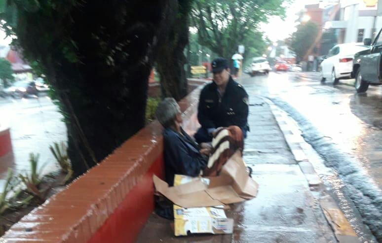 OBERÁ. Esta mañana efectivos de la división Prevención de Delitos, dependiente de la Unidad Regional II, asistieron a un hombre de 65 años que se encontraba desprotegido bajo la intensa lluvia qie se registró en esta ciudad. El sexagenario estaba en una plazoleta ubicada en la zona céntrica de Oberá.