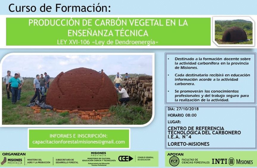 LORETO. La comunidad educativa del Instituto de Educación Agropecuaria (IEA) 4 invita al curso de formación en Producción de Carbón Vegetal en la enseñanza técnica que se llevará adelante el 27 de octubre, a las 8, en dicho establecimiento de Loreto. Se promoverá los conocimientos profesionales y del trabajo seguro.