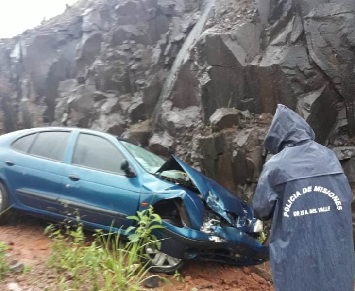25 DE MAYO. Siendo las 11:00 se tomó conocimiento en la Guardia de Prevención de esta Dependencia Policial que sobre Ruta Pcial 8 a unos 150 metros aproximadamente del Puente Arroyo Torto se habría producido un despiste de un vehículo. Constituida Comisión Policial al citado lugar establecidos que vehículo marca Renault Megane Dominio DMD-167 conducido por el ciudadano Szmandiuk Mario Enrrique 45 años DNI 23.664.678 Ddo José Hernández 1218 de la Ciudad de Obera circulaba por la mencionada Ruta en sentido de circulación Campo Grande – 25 de Mayo y en momento dado pisa un charco de agua existente en la Ruta y pierde el control del rodado embistiendo Paredon de piedra existente sobre la banquina del costado derecho de la Ruta, resultando con lesiones de carácter leve el conductor del mismo, siendo trasladado hasta el Hospital de Área Local y examinado por la Dra CARINA FERREYRA Diagnostico: Herida rodilla derecha y hematoma facial TPC 3 días