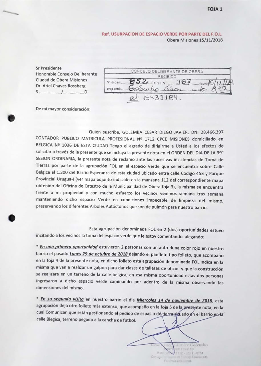 Vecinos molestos con la insistencia del FOL de usurpar un espacio verde en barrio Esperanza