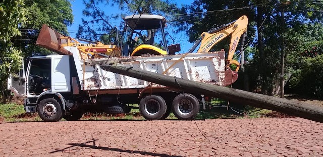 SAN VICENTE. Cerca de las 10:30 del martes un camión Fiat Iveco circulaba por Calle Horacio Quiroga, Barrio San José, en sentido Norte-Sur, trasladando una máquina retroexcabadora. Al llegar casi a la mitad de la cuadra engancha cables telefonicos, produciendo caída de un poste y cables eléctricos.