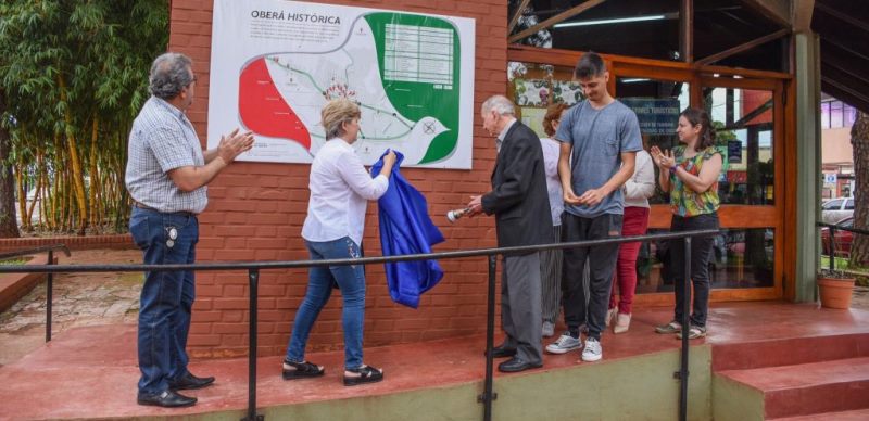 OBERA. Ayer por la mañana en la Casilla de Turismo de la Ciudad de Oberá, se descubrió un cartel con infografía de los lugares de valor histórico en nuestra ciudad, esto realizado en el Marco de los 90 años de nuestra ciudad y 25 años de la Junta de Estudios Históricos.El mismo surge como una inquietud del Sr. Mambrin miembro de la Junta de Estudios Históricos, quien en conjunto con la responsable del Área de Cultura Lilian Vega presentaron el proyecto ante la Facultad de Arte y Diseño con la finalidad que desde esa alta casa de estudios se diseñara dicho cartel, la FAyD, por su parte lo estableció dentro de la cátedra de Diseño Gráfico, y en forma de concurso se presentaron más de 10 proyectos. El resultado final se coloco en la fachada de acceso a la Casilla de Turismo acompañaron dicho acto el Secretario de Coordinación: Santiago Marrodán, la Directora de Turismo, La jefa del Área de Cultura, miembros de la Feria el Libro y la Junta Histórica, la responsable de la Carrera Prof. Dg. Claudia Alejandra Marinaro en representación de la FAyD., y por supuesto los alumnos ganadores Maximiliano Villalba – Bruno Zabczuk – Emanuel Cassini y sus compañeros de curso y futuros colegas.