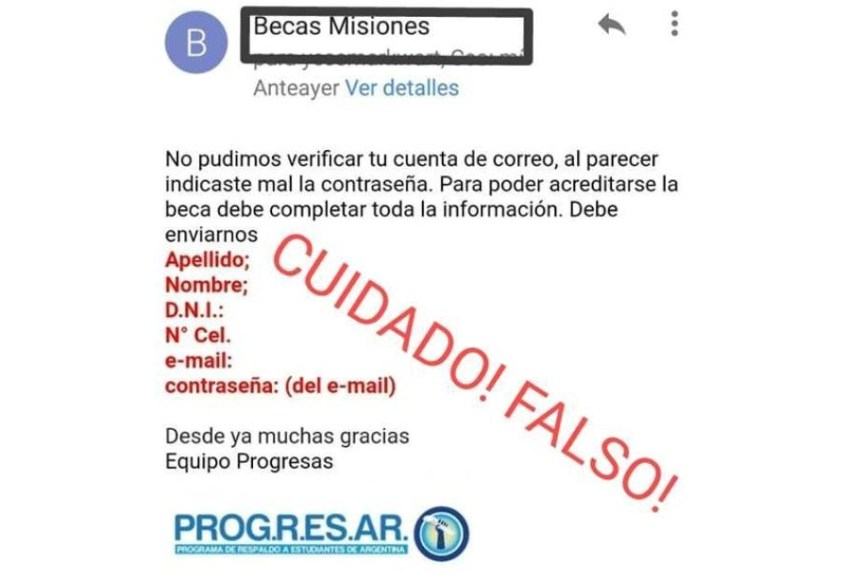 La información surge a partir de las consultas que se realizaron desde los Institutos de Formación Docente y Tecnicaturas donde manifestaban la preocupación de alumnos que habían recibido un correo de la cuenta “becas misiones” solicitando información personal y, específicamente, la contraseña para ingresar al sistema.