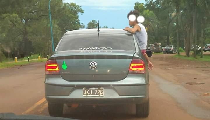 OBERA. La foto circuló por las redes sociales causando indignación ante los frecuentes siniestros viales que ostenta la provincia y el país. Ocurrió el lunes sobre la ruta 4, tramo entre San Javier y Alem. Un niño viajaba con casi todo el cuerpo fuera sobre la ventanilla de un auto.