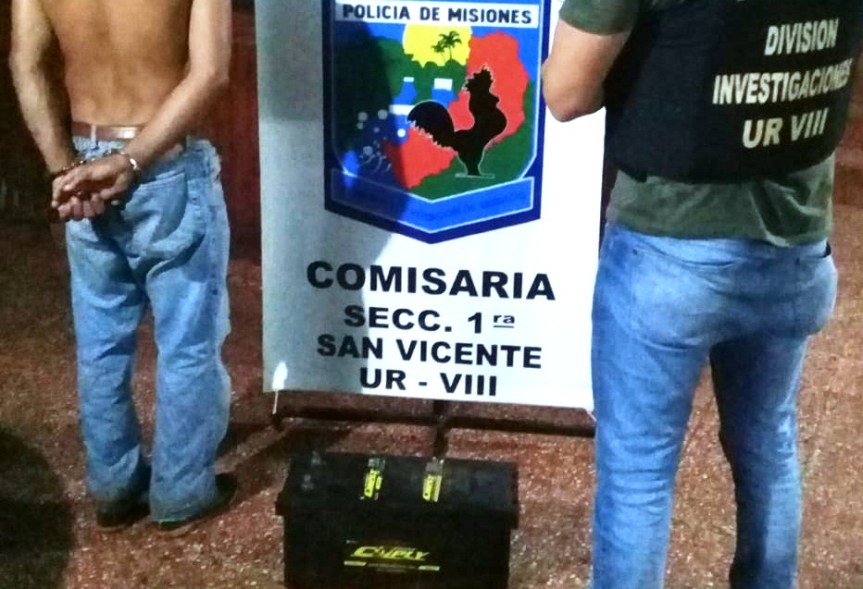 SAN VICENTE. A las 19:20 horas de ayer viernes en una zona conocida como “la cantera” detuvieron a Sergio M. (33) y en su poder secuestraron una batería de 190 amperes que horas antes había sido sustraído de un predio municipal ubicado en el barrio Cochir.