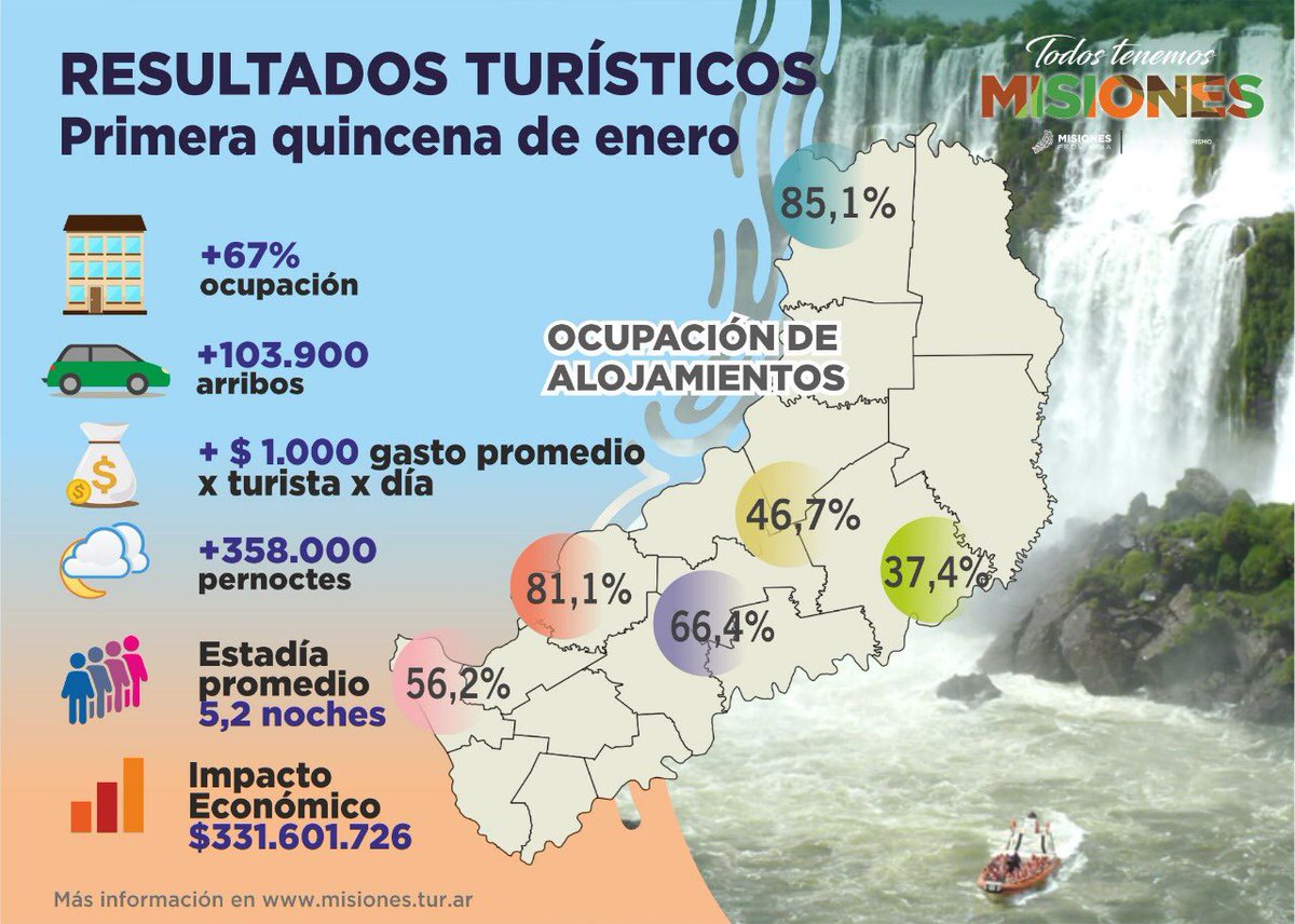 En cuanto a Iguazú, recibió 90 mil visitas al parque nacional Cataratas en los primeros quince días del año, un récord histórico. En porcentaje de ocupación hotelera, supera solo un 20 % a Oberá. Claro que posee más de 6 mil camas disponibles.