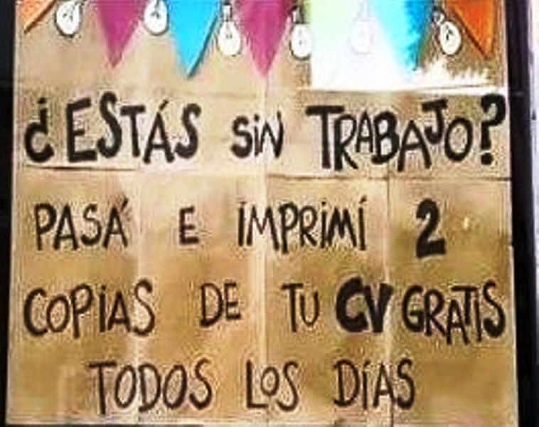 «¿Estás buscando trabajo? Pasa e imprimí 2 copias de tu Currículum Vitae gratis todos los días» dice el cartel colocado en el frente de la librería.