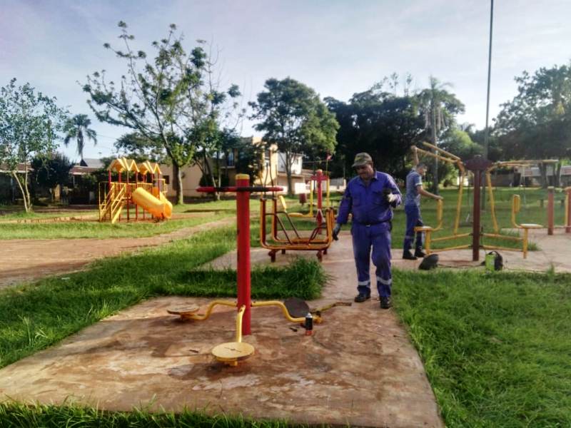 OBERA. Trabajadores municipales realizan el mantenimiento de plazas y plazoletas, como así también de las máquinas para hacer ejercicios y juegos que hay en las mismas.