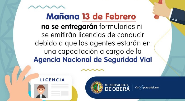 OBERÁ. Este miércoles 13 de febrero no se podrán retirar formularios ni emitir licencias de conducir, dado a que todo el personal municipal del área participará de una capacitación por parte de la Agencia Nacional de Seguridad Vial.